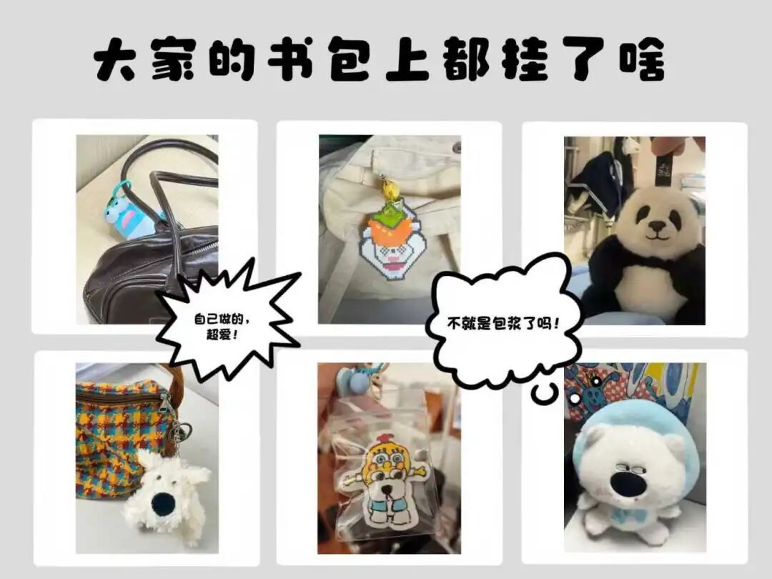 学校里、家里、外出游玩的路上 “包挂”随处可见 可能是 一只盘到包浆的小狗 一个自制的小福狸拼豆 甚至是 某个精神状态拉满的“丑东西”