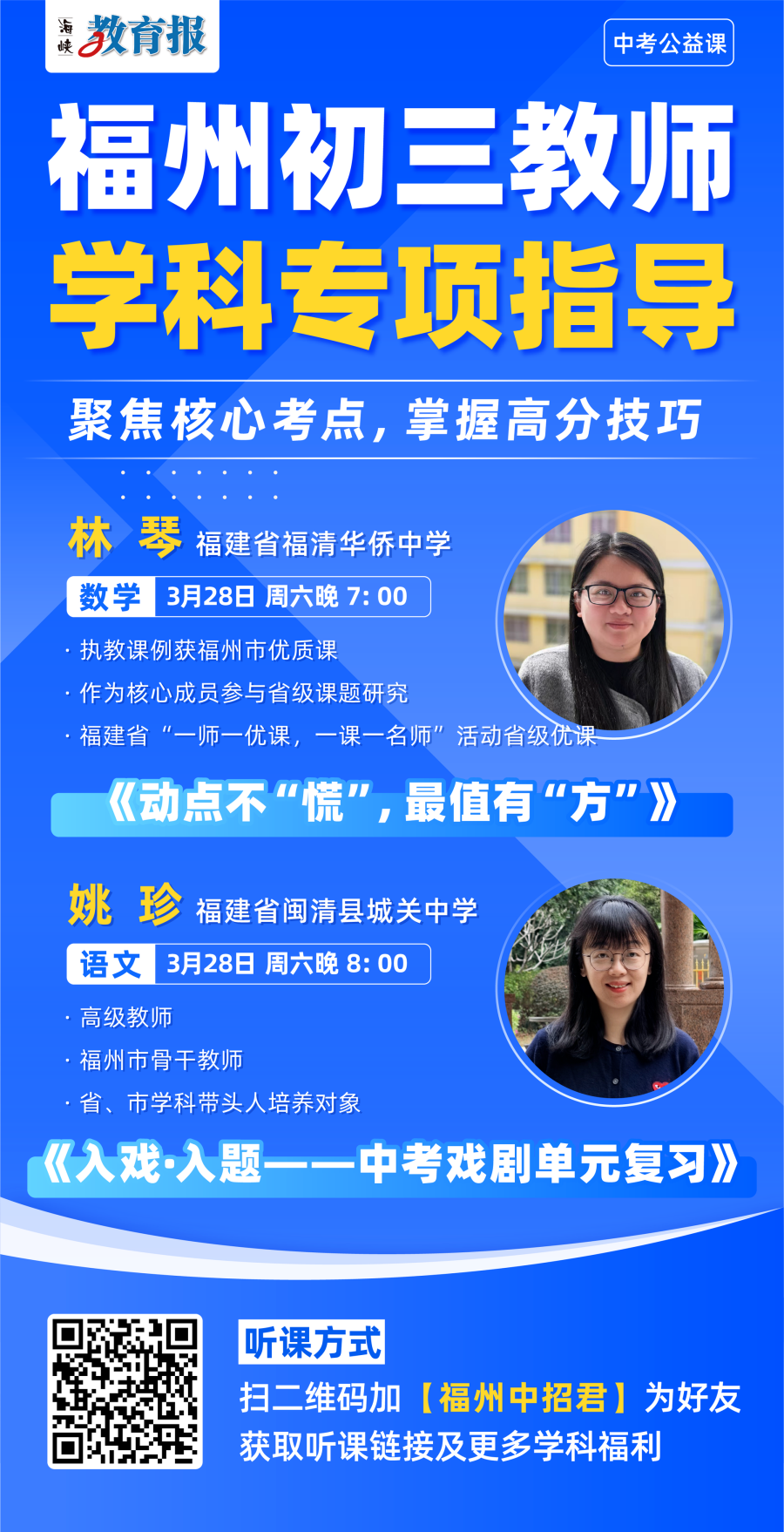 在福建中考数学中 几何最值问题 一直是高频考点 也是失分重灾区 当动点在 几何图形中移动时 我们如何确定 它的“最短路径”? 读戏剧 只看情节就够了吗? 语文《课程标准》提醒我们 要深挖人物情感与思想内核 面对一波三折的冲突 句句藏机的台词 如何才能不偏航 精准把握剧本灵魂? 本周六晚7:00开始 《海峡教育报》公益直播课 将邀请 福清华侨中学 林琴老师 闽清城关中学 姚珍老师 带来 线段最值的几何解法专题指导 中考戏剧专题指导