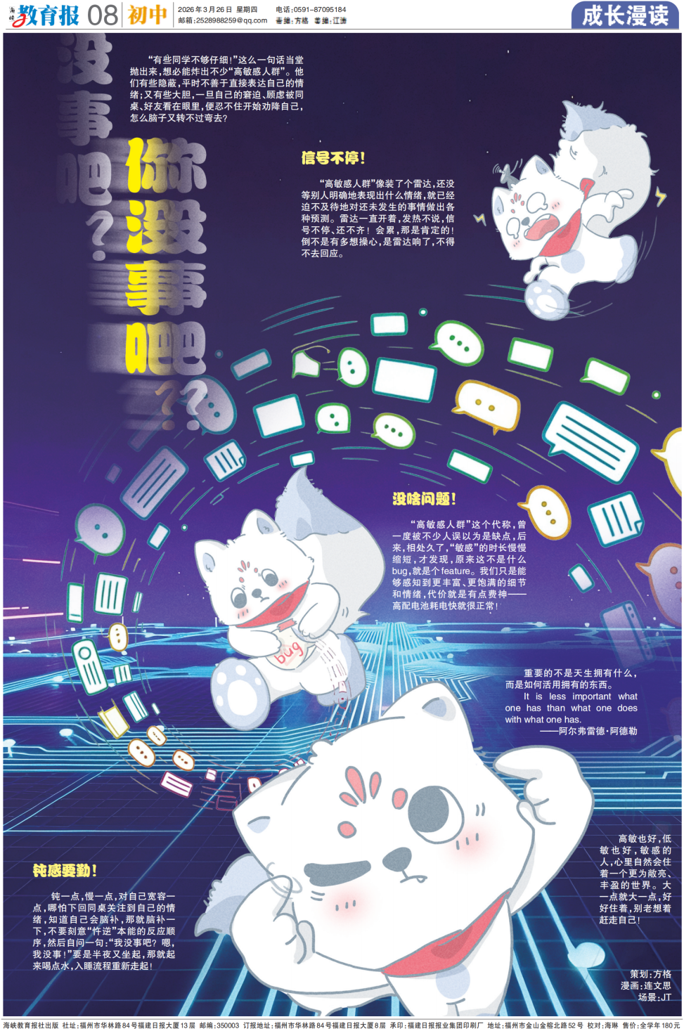 “有些同学啊,还是不太仔细,下回要注意。” 这句话无论什么时候拿出来,都能叫人倒吸一口凉气,全班四十多个人,其他人可能只是扫一眼卷子——云淡风轻但自己是听进去了,还顺便生了个窝囊气—— “有些同学”=“绝对是在说我!” “不太仔细”=“完啦,是说那道白瞎的题。” “下回要注意”=“哈哈,是我没跑了。” 这就是“高敏感人群”的特质 表面,脸不红心不跳 内心,实则演了百八十种可能性 本期《成长漫读》 带你一起见识“高敏感”特质