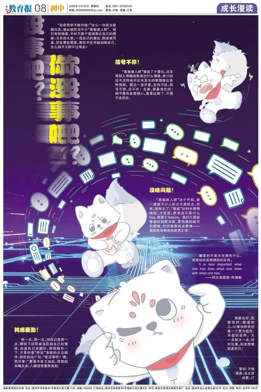 高敏感人群自救指南 没事吧?你没事吧? 当世界太吵, 福狸教你快速启动“钝感”! 《成长漫读》版带你一起研究 “信号不停”背后的心理学! 新闻+学科 把知识讲得比葡萄干还甜! 在《海峡教育报》 都能找到属于你的那道题! 快翻开报纸, 解锁更多精彩内容! |