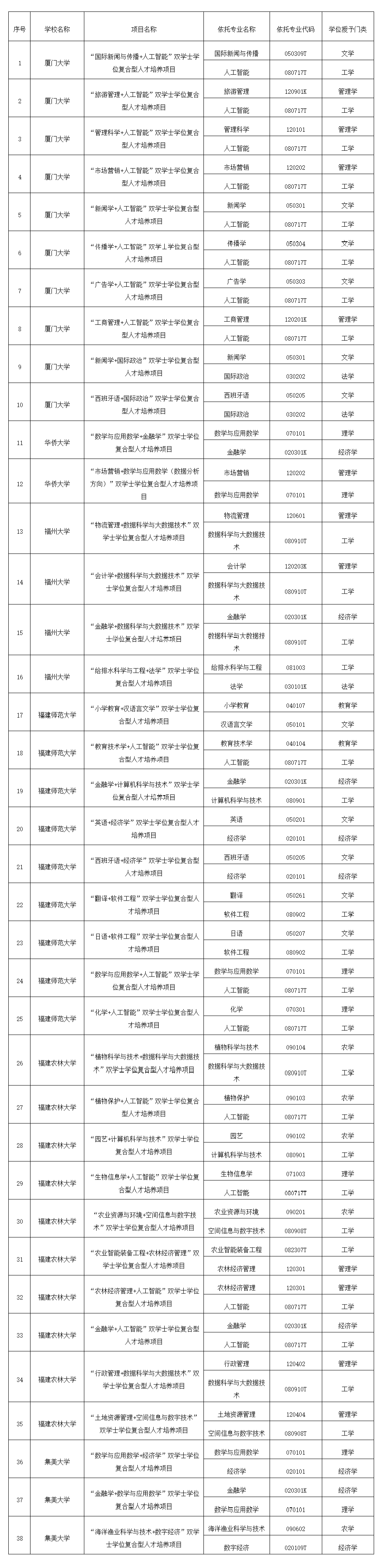 根据《福建省学士学位授权与授予审核管理办法》(闽学位〔2022〕3号),经高校申报、省学位办审核,现对38个拟新增双学士学位人才培养项目予以公示。 公示时间:2026年4月3日至10日。 公示期内,如有不同意见,请向我办提出。以单位名义反映的应加盖公章,以个人名义反映的应署真实姓名、身份证号和联系电话(我办将为反映人保密)。 联系电话:0591-87091268 传 真:0591-87846780 福建省学位委员会办公室 2026年4月3日 点击下方图片查看完整名单↓