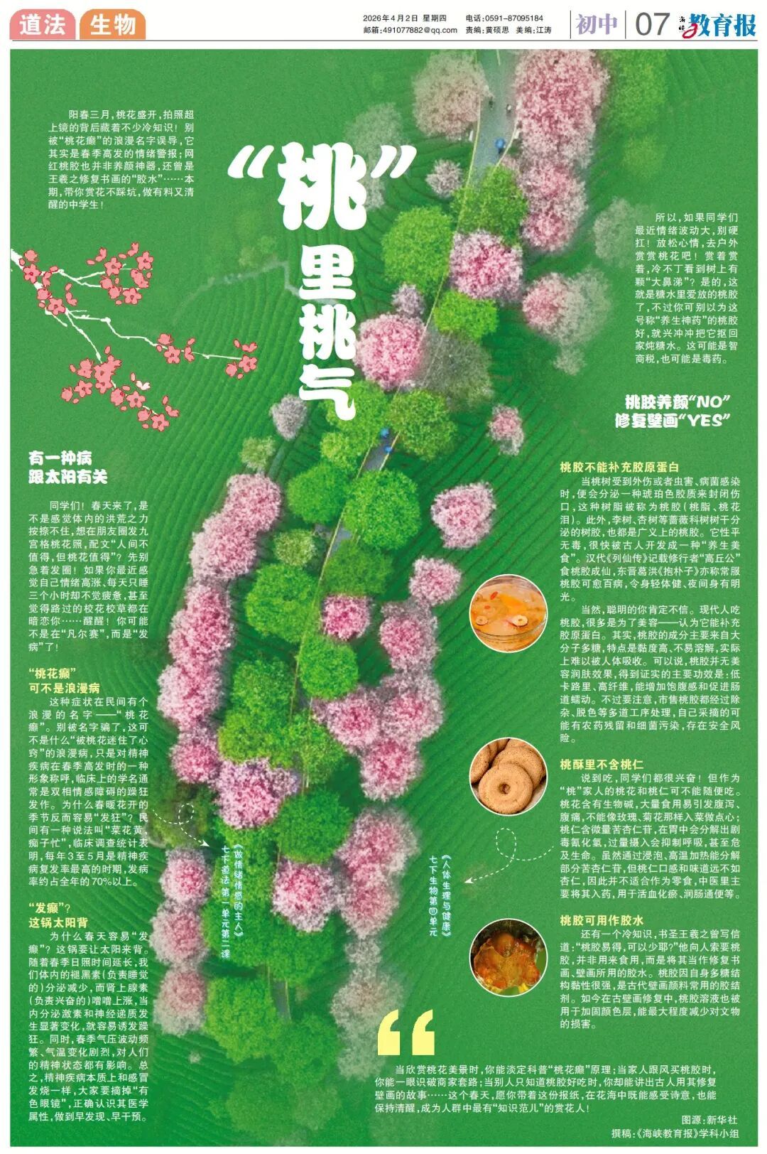 “桃花癫” 可不是浪漫的代名词 它其实是 春季高发的情绪警报 版面围绕桃花展开 将自然现象与文化、 学科知识相结合 内容丰富有趣 卷什么卷?“外耗”啊!