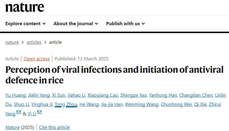国家杰青获得者李毅教授2023年8月全职引进到福建农林大学后,在前期带领北京大学团队长期研究的基础上,联合福建农林大学等多个实验室,近日在国际顶级学术期刊Nature(《自然》)杂志上发表了题为“Perception of viral infections and initiation of antiviral defence in rice”(水稻感知病毒侵染并启动抗病毒防御的机制)的研究论文,首次揭示了水稻如何感知病毒入侵并激活抗病毒免疫反应的核心机制。