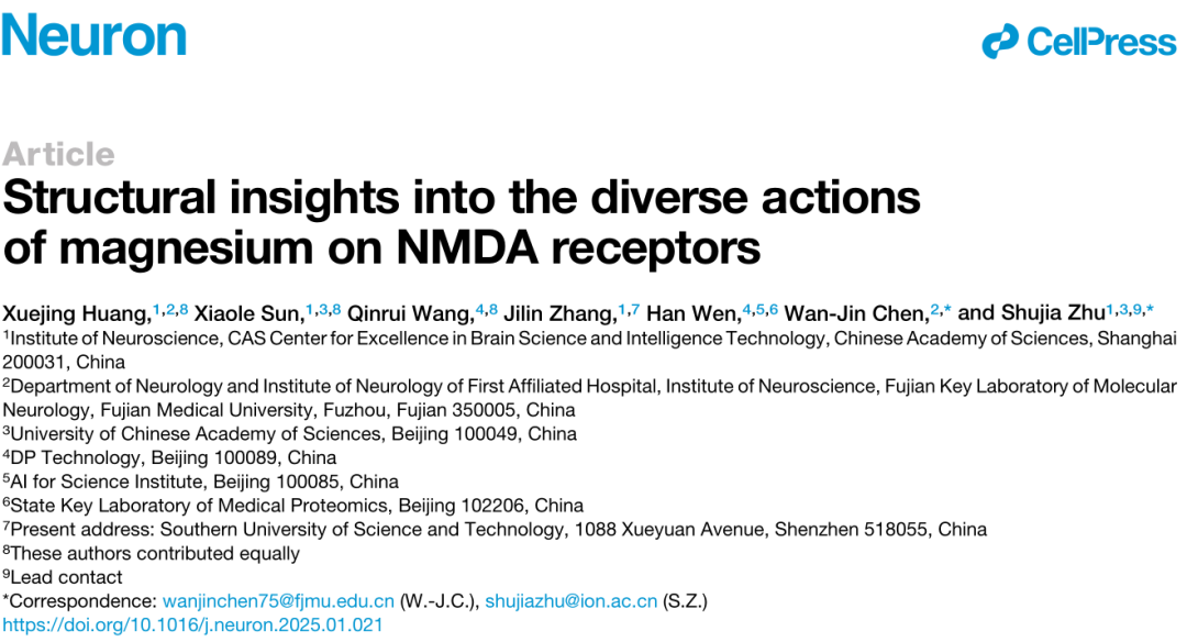 近日,福建医科大学与中国科学院脑科学与智能技术卓越创新中心联合培养的2023级博士研究生黄雪晶以第一作者在神经科学期刊《Neuron》上发表重要研究成果《镁离子对NMDA受体多重调控机制的结构基础》。此项成果是中国科学院脑科学与智能技术卓越创新中心(神经科学研究所)和福建医科大学合作共同完成的。中科院脑智中心的竺淑佳研究员和学校陈万金教授为共同通讯作者。
